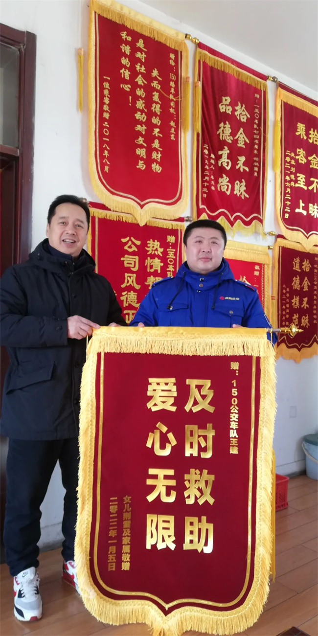 1月9日上午,老人的家屬再次來到車隊,還特意為駕駛員王建制作了一面錦旗,上面寫有“及時救助,愛心無限”的字樣,表達了無限的感激之情。當家屬把錦旗送到王建手中,他不好意思地說道:“這都是我應該做的?!?/p>