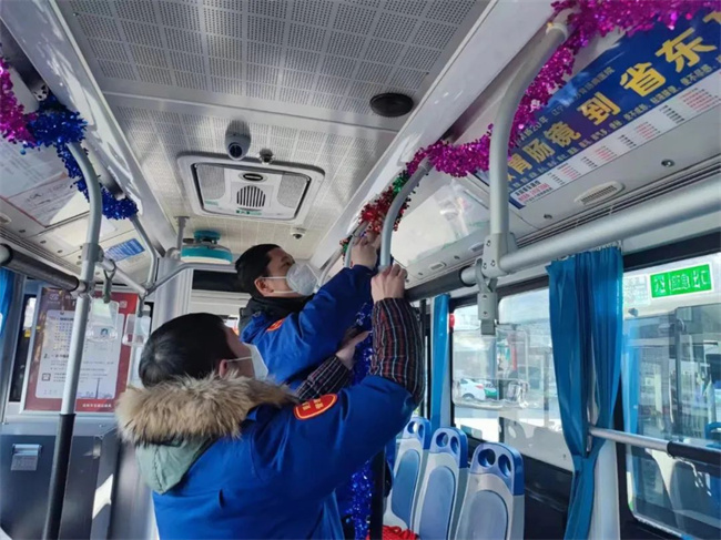 在209路車隊(duì),車廂、站務(wù)室、辦公區(qū)域處處洋溢著喜慶的中國風(fēng),生肖窗花張貼在車窗兩側(cè),可愛的卡通兔“微笑”著向乘客們送著“祝?!?,“新年快樂”的拉花昭示著中華民族的傳統(tǒng)佳節(jié)即將到來。