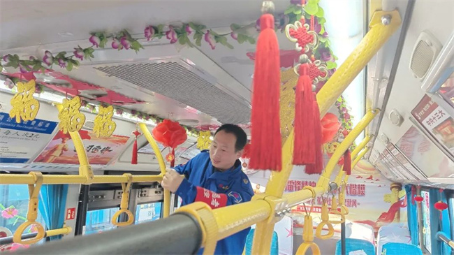 在辭舊迎新之際,通運(yùn)公司249路駕駛員王眾自費(fèi)購(gòu)買了小燈籠,拉花,窗花,福字等飾品來(lái)扮靚自己的愛(ài)車。被精心“打扮”后的車廂,年味十足。