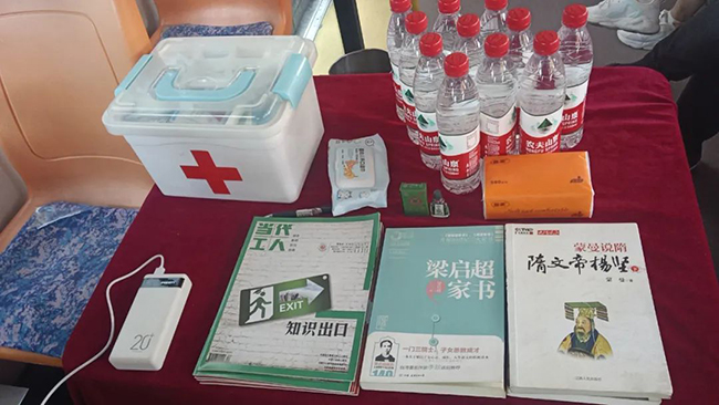 車身懸掛著“以夢為馬,不負(fù)韶華,中考砥礪前行”“九年寒窗,在此一搏,沖刺中考,奮斗今朝”等祝福條幅,車廂內(nèi),飲用水、充電寶、文具、應(yīng)急藥物、雨傘、紙巾以及書籍應(yīng)有盡有。不一會兒,車內(nèi)就坐了不少家長,對此,家長們很是感動,感謝車隊(duì)和王師傅提供的休息場所。