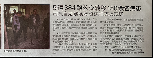醫(yī)院里有不少肢體障礙的病人、生活不能自理的病人,還有一些精神病患者,從醫(yī)院轉(zhuǎn)移到車?yán)锸殖粤?。留下?名駕駛員和下班后聞?dòng)嵹s到的馮永斌等7名駕駛員毫不猶豫地沖上前,連扶帶抬,連背帶扛,將患者轉(zhuǎn)移到車上。醫(yī)院對面就是火場,駕駛員們不顧自身安危,連水都來不及喝上一口,緊張有序、有條不紊的進(jìn)行疏散工作。直至晚23時(shí)30分,成功將所有醫(yī)患人員輸送至馬耳山分院。