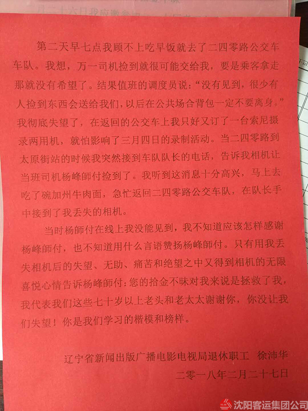 原來(lái),當(dāng)日下午徐沛華老人剛剛參加完老工友聚會(huì),在乘坐240路公交車回家時(shí)將攜帶的攝影包遺落在車上,到家后才發(fā)現(xiàn)自己的攝影包丟失了。老人回想可能是遺落在240路車上了,他抱著試試看的態(tài)度來(lái)到240車隊(duì),令他沒(méi)想到的是,相機(jī)完好無(wú)損的在那里等待它主人的到來(lái),失而復(fù)得的喜悅讓老人激動(dòng)不已,老人說(shuō),“昨晚我一夜沒(méi)有睡好,相機(jī)里的照片和視頻對(duì)我來(lái)說(shuō)是非常珍貴的,要是丟了我真不知道怎么辦才好,真的非常感謝駕駛員楊峰同志......”隨后,老人親自把“拾金不昧 弘揚(yáng)正氣”的錦旗送到了楊峰手中,“楊師傅的這種拾金不昧的精神是雷鋒精神的一種傳承,是現(xiàn)在年輕人學(xué)習(xí)的榜樣”,老人激動(dòng)的說(shuō)。在公交車這個(gè)不足十平米的車廂里,楊峰用自己的善舉為城市文明傳遞著一份正能量。