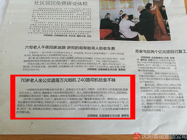 近日,一位古稀老人把價(jià)值近萬(wàn)元的單反相機(jī)遺落在240路公交車上,幸運(yùn)的是,被好心駕駛員楊峰及時(shí)發(fā)現(xiàn)并完璧歸趙。