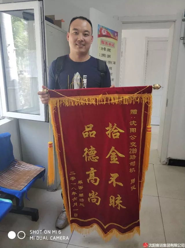 2018年6月2日上午,通利公司289路車隊辦公室來了一名男乘客,手拿錦旗滿臉笑容的找到車隊殷隊長,感謝車隊幫忙找回重要的失物,使物品完好無損,現(xiàn)金、證件等無一損失,感謝拾金不昧的90后289路駕駛員周健。